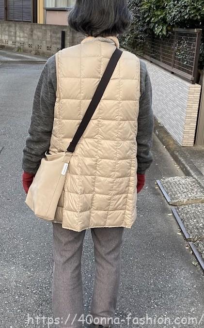 お尻がすっぽり隠れるタイプのダウンベストを紹介します。室内はもちろん、お尻までカバーするので外にも着ていけます。