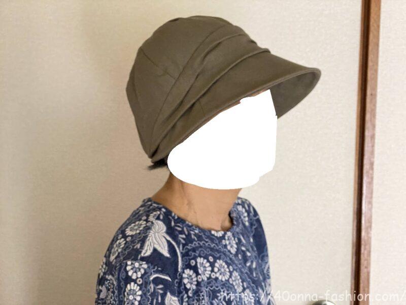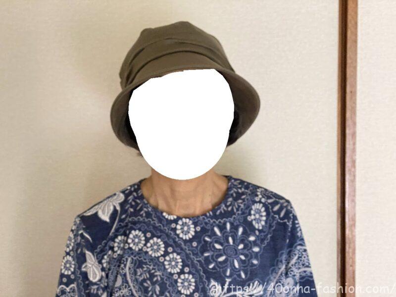 被るとこのような感じです。70代の母親にかぶってもらったところを撮影しました。