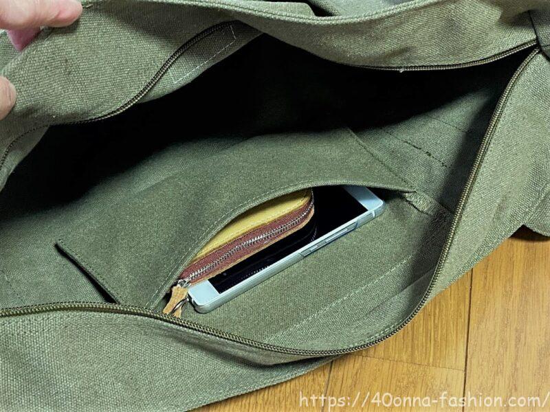内側にはスマホやお財布があるポケットがついています。これも意外と便利です。