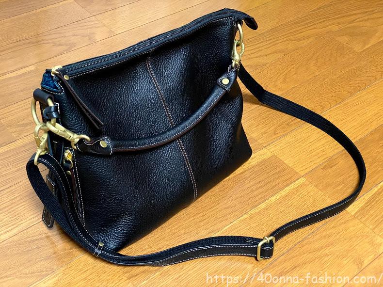 カラーは黒を選びましたが、無難でどこに行くのにも使えます。斜め掛けにしても、きちんと感のあるバッグです。